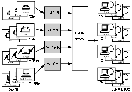 對通信媒體多樣性的支持是非常重要的,其中通信媒體包括電話、交互語音應答、email、Web業(yè)務、傳真以及文件處理。為了處理通信媒體的多樣性,系統(tǒng)可能被分成多個子系統(tǒng),每個子系統(tǒng)對應一種媒體類型。子系統(tǒng)將輸入的通信信息通知給負載序列,并且一直保留該通信信息,直到收到負載序列準備路由該通信信息的消息。然后子系統(tǒng)按照負載序列的指令將通信信息發(fā)送到正確的代理坐席或設備。