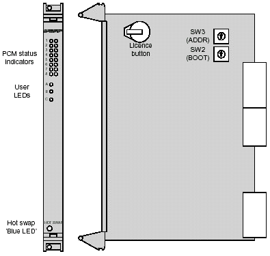 Septel cP板卡的前板上有狀態(tài)指示器。當板卡重置以后,所有的PCM狀態(tài)指示器保持開的狀態(tài),直到板卡上的軟件開始運行。