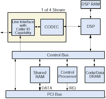 一個板卡上的微處理器控制D/4PCIU和D/4PCIUF通過一個本地總線控制板卡所有操作,它從主機截獲和執(zhí)行命令。這個微處理器處理實時的事件,管理和主機交互的數(shù)據(jù)流,提高系統(tǒng)的反應時間,減少主機處理的需求,傳遞給應用程序之前處理DTMF和電話信令,把DSP解脫出來專門做信令處理。這個微處理器和主機的通信是通過一個共享RAM,它作為一個輸入/輸出緩沖區(qū)增加的磁盤文件傳輸?shù)男省_@個RAM和主機的接口是PCI總線。為了滿足實時系統(tǒng)的要求,所有操作的是中斷驅(qū)動的。所有安裝在PC里面的D/4PCIUF板卡共享同一個中斷。在系統(tǒng)初始化的時候,固件從主機下載到板卡上的代碼/數(shù)據(jù)