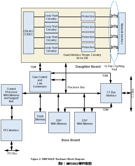 從連接到DMV160LP板卡的16條環(huán)路電話線上來的信號首先要通過電話線接口,該接口可以提供對瞬間電流的保護(hù)以及對電磁干擾的抑制。這些電話線接口使用了可靠的晶體開關(guān)(沒有機(jī)械連接)和FCC-Part