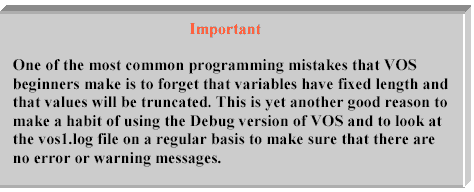 變量長度有限制,如果字符串的長度大于最大長度,則按最大長度取值。如果在調(diào)試模式下運(yùn)行VOS,當(dāng)一個(gè)字符串被截短后會(huì)彈出一個(gè)警告信息。(如果要避免這些告警,賦值時(shí)使用substr函數(shù))