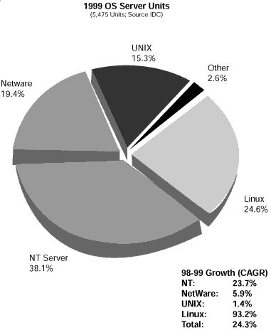 而且,在1999年Linux服務(wù)器增長(zhǎng)率大約在98.3%,遠(yuǎn)遠(yuǎn)超過居于第二位的Windows的24%的增長(zhǎng)率。