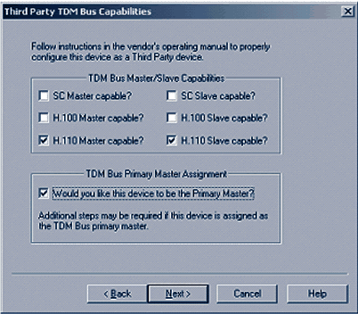 現(xiàn)在需要選擇合適的TDM總線的功能,對(duì)合適的類型(對(duì)于PCI,選擇H.100,對(duì)于CompactPCI,選擇H.110),您需要選擇主選項(xiàng)和客戶端選項(xiàng)。如果該設(shè)備將要為CT總線(客戶端服務(wù)器)提供主時(shí)鐘,選中TDM總線主控制選項(xiàng),然后單擊下一步。圖5顯示的是CompactPCI服務(wù)器在系統(tǒng)中配置為客戶端服務(wù)器的選擇。